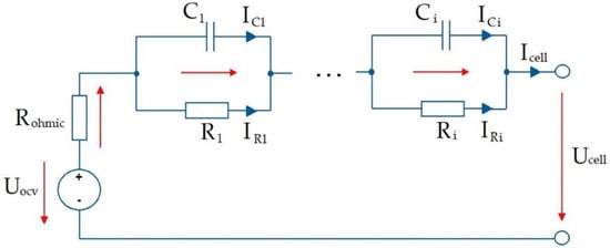 where ICi (A) is the current through the cell capacitor, and Ri (Ω) is the resistance of each resistor–capacitor (RC) element of the cell.