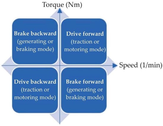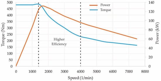 Electric buses are powered by an electric motor, asynchronous motor (ASM) type, which operates in electric-motor mode, consuming battery power, or in generator mode, recovering the energy when descending slopes or in particular braking situations. The operating characteristic of the electric propulsion system is described by the motor torque diagram vs. speed, for all the possible traction regimes (Figure 5) [38,46,47].