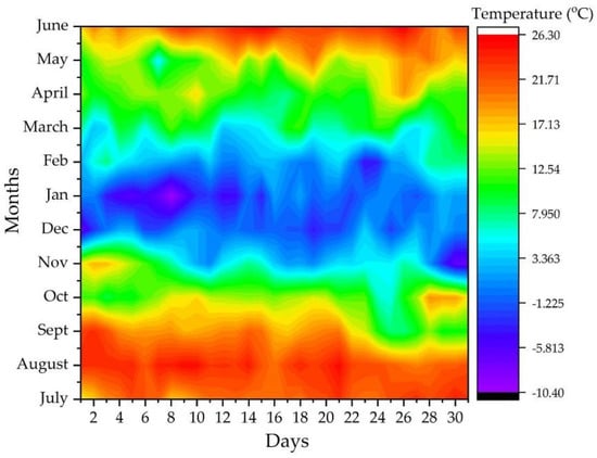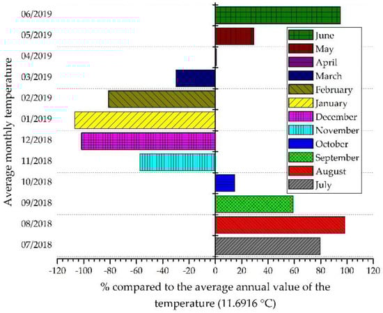 The meteorological data regarding the temperature history for Cluj-Napoca, related to the monitored period (July 2018–June 2019), were taken from the archive of the weather station rp5.ru [52]. The average daily values for temperature were calculated as the average values for the electric buses operating at hourly intervals, from the beginning of the program (5:00 a.m.) to the end of the program (11:00 p.m.), based on daily records of variations in temperature values, obtaining the results that are presented in Figure 7.