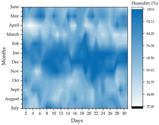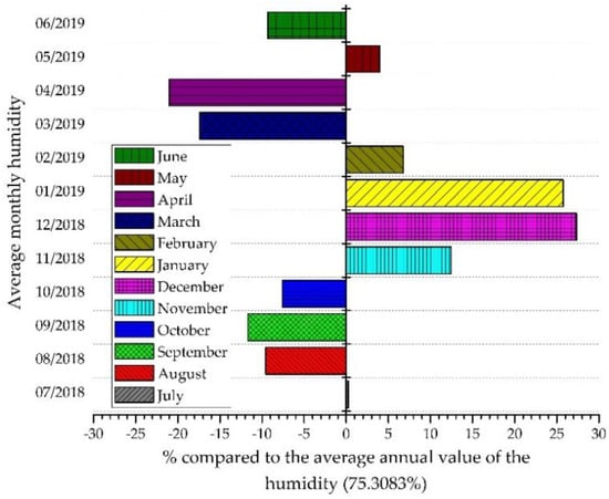Similar to the temperature history (See Section 2.2.1), compared to the monitored period (July 2018–June 2019), data were taken regarding the values for the atmospheric humidity [52]. The average values for the atmospheric humidity were calculated as the average values for the electric buses operating at hourly intervals, based on daily records of the variations for the atmospheric humidity values, obtaining the results that are presented in Figure 8.