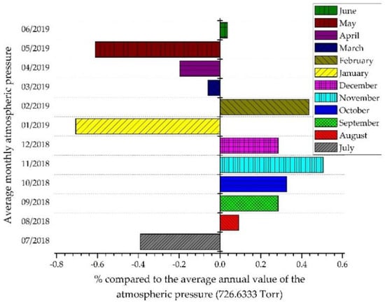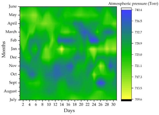 Similar to the temperature history (see Section 2.2.1), compared to the monitored period (July 2018–June 2019), data were taken regarding the atmospheric pressure values [52]. The average values for the atmospheric pressure were calculated as the average values for the electric buses operating at hourly intervals, based on the daily records of the atmospheric pressure values’ variations, obtaining the results that are presented in Figure 9.