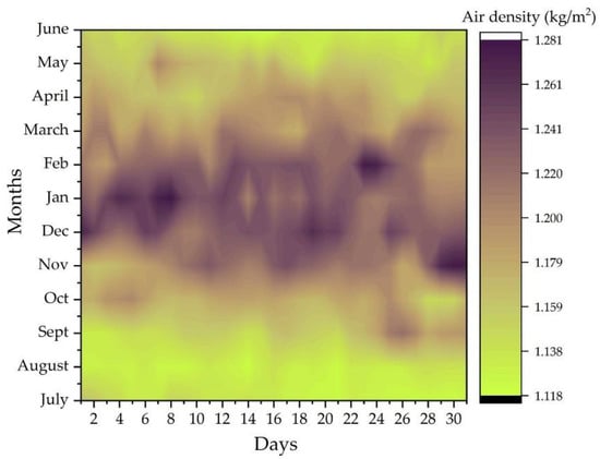 The average daily air-density value (Figure 10) was calculated based on the average daily recordings of the thermal values, using the following relation [53]:
