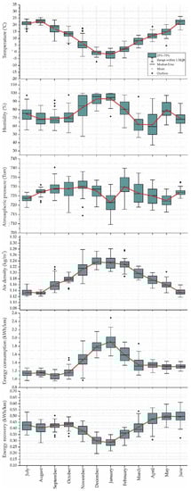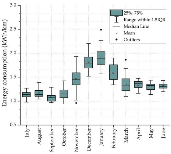 The evaluation of the energy consumption data on the electric buses for the monitored period (July 2018–June 2019) was performed with a Boxplot graph (Figure 11 and Table 3) which, based on the initial data, generates a statistical model for each monitored month.