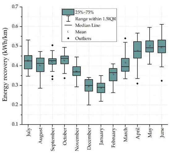 The evaluation of the data regarding the energy recovered by the regenerative braking of the electric buses for the monitored period was performed with a Boxplot graph (Figure 12 and Table 4) which, based on the initial data, generates a statistical model for each monitored month.