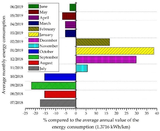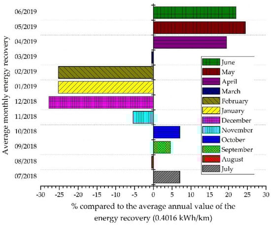 The winter months (December 2018 and January 2019) were the months with the lowest temperatures in the entire monitored period. In addition to the negative temperatures of the day, the start of the working program for the electric buses took place below the freezing threshold. Electric buses, which are connected overnight to the external slow-charging stations, and the batteries are heated by the thermal management system, consume, on the cold winter days (with temperatures below −10 °C) up to 10% of the energy from the batteries, for heating the interior passenger compartment, only in the interval of preparation for the buses’ departure on the route. Thus, combined with the increased of the daily consumption and the wet road conditions, it is reached that, during the cold season, the consumption increase by 2 to 2.5 times compared to the periods with the lowest values of consumption, and the energy values recovered will near zero. During these months, the monthly average temperatures (see Table 5) were lower than the annual average by 101.71% in December 2018 and by 106.84% in January 2019 (see Figure 14), the humidity was higher than the annual average with 27.34% in December 2018 and with 25.75% in January 2019 (see Figure 15), and the atmospheric pressure was higher than the annual average, with 0.28% in December 2018 and lower, with 0.71% in January 2019 (see Figure 16). The result was a higher energy consumption than the average annual consumption, with 29.77% in December 2018 and 38.52% in January 2019 (see Figure 17), and a reduced amount of energy recovery compared to its annual average, by 27.80% in December 2018 and by 25.31% in January 2019 (see Figure 18).