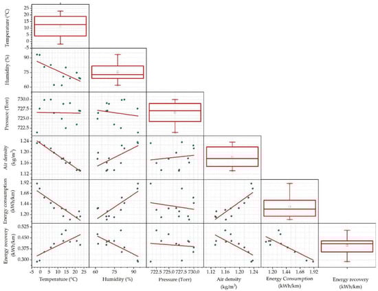 The energy balance recorded during the monitored period (July 2018–June 2019) for the Solaris Urbino 12e electric buses, depending on the atmospheric conditions (ambient temperature, atmospheric humidity, air pressure, and density) is shown in Table 5 and Figure 13.