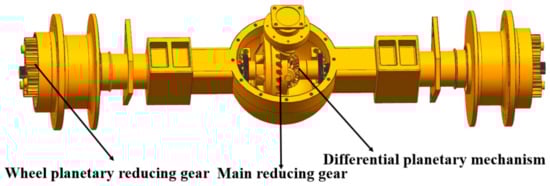 - By establishing a three-dimensional digital model of a loader drive axle, the transmission efficiency of the main reducing gear, the differential planetary mechanism, and the wheel planetary reducing gear of the loader drive axle are studied. The transmission efficiency functional relationship between the loader drive axle and the main reducing gear, differential planetary mechanism, and wheel planetary reducing gear were obtained; that is, a functional relationship between the transmission efficiency of the loader drive axle and the gear mesh friction coefficient, the mesh power loss coefficient, the normal pressure angle, the helix angle, the offset amount, the speed ratio, and the characteristic parameters.