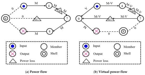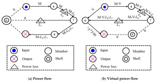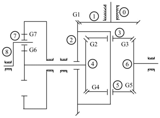 The diagram of the differential planetary mechanism of the loader drive axle shown in Figure 2 can be converted into the diagram shown in Figure 4 when considering the gear mesh power loss. The gear mesh power loss is proportional to the input power, and the proportional ratio is called the mesh power loss coefficient, so , , and indicate the mesh power loss passing through the gear pairs , , and , respectively, which are expressed by Equations (9)–(11), respectively: