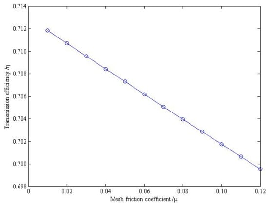 To analyze the influence of the mesh friction coefficient μ of the main reducing gear on the transmission efficiency η of the loader drive axle, the curve of the transmission efficiency η of the loader drive axle and the mesh friction coefficient μ of the gear teeth were drawn under the condition that the other parameters shown in Equation (25) were unchanged (Figure 7). According to Figure 7, the transmission efficiency η of the loader drive axle decreased when the mesh friction coefficient μ of the main reducing gear increased under the condition that the other parameters were unchanged. Simultaneously, the mesh friction coefficient μ of the main reducing gear was 0.05, and the transmission efficiency η of the loader drive axle was 0.707.