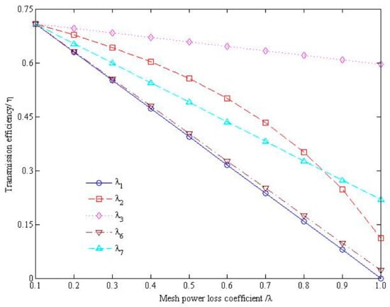 To determine if the transmission efficiency η of the loader drive axle is affected by the mesh power loss coefficient λi, the curve of the transmission efficiency η of the loader drive axle and the mesh power loss coefficient λi was drawn under the condition that the other parameters shown in Equation (25) were unchanged (Figure 8). According to Figure 8, the transmission efficiency η of the loader drive axle decreased as the mesh power loss coefficient λi increased. That is, the transmission efficiency η of the loader drive axle decreased as the mesh power loss coefficients λ1 and λ6 increased, and it also decreased as the mesh power loss coefficients λ3 and λ7 increased. As the mesh power loss coefficients λ3 and λ7 increased, the transmission efficiency η of the loader drive axle decreased, but the degree of decrease was slower than λ1 and λ6; as the mesh power loss coefficient λ2 increased, it initially decreased slowly and then sharply.