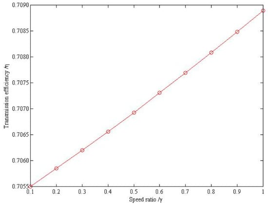 To determine if the transmission efficiency η of the loader drive axle is affected by the speed ratio γ, the curve of the transmission efficiency η of the loader drive axle and the speed ratio γ were drawn under the condition that the other parameters shown in Equation (25) were unchanged (Figure 9). According to Figure 9, the transmission efficiency η of the loader drive axle increased with the increase of the speed ratio γ when the other parameters were unchanged, but the transmission efficiency η ranged from 0.7055 to 0.7090; that is, the modification of the speed ratio γ had no obvious effect on the transmission efficiency η of the loader drive axle.
