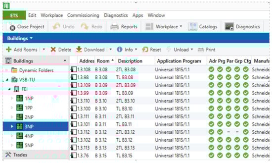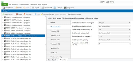 KNX technology is a worldwide standard in the field of wiring of intelligent buildings and their automation. It is a decentralized solution. KNX technology provides the interconnection of KNX modules using the Twisted pair (TP) communication medium. The devices used in this work are an MTN6005-0001 sensor of CO2, temperature, and air humidity (technical parameters: current consumption from the bus, max. 10 mA; ambient temperature, −5 to 45 °C; measuring range for CO2, 300–9999 ppm; measuring range for temperature: 0–40 °C; and measuring range for humidity, linear 20–). A laboratory (EB312) on the premises of the building of the new FEI at VSB Technical University of Ostrava was used as the experimental location. This location often holds educational classes or it is visited by staff and researchers. Furthermore, in this laboratory, there are bus buttons MTN6172 and MTN6171 for controlling the lighting and switching off (disconnecting) the sockets. In the switchboard in the corridor, there is the switching actuator MTN 649204 and, for lighting control, the dimming actuator KNX/DALI gate MTN680191. Each device in the KNX installation has an identifiable individual address and, together with other devices, forms a function block using a group address. As a whole, these components have been parameterized into a functional unit in the ETS5 configuration software offered by KNX associations (Figure 1).