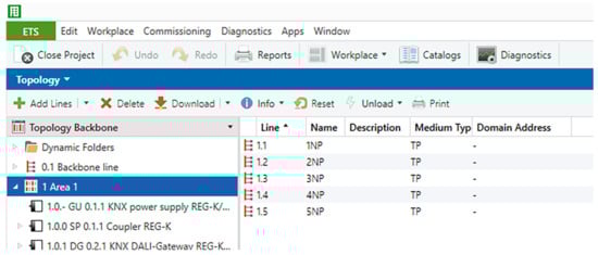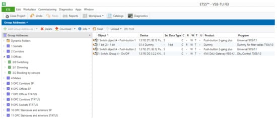 The connection between the lines is provided by a bus coupler, which allows connection of up to 64 KNX modules. To ensure proper communication between the individual KNX modules by means of the KNX telegram, a group address, which uniquely determines the functionality of the individual operational and technical functions, is defined (Figure 4) []. The topology in the KNX installation consists of the backbone, the main line, and five secondary lines (Figure 3).