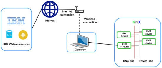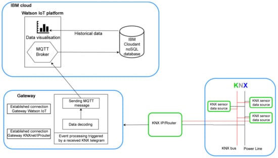 KNX Association, in response to the expanding IoT trend, introduced its own solution—KNX Web Services. This solution removes obstacles to accessing KNX as part of the Internet of Things. It enables reliable integration of a large installation in which multiple suppliers and manufacturers are installed. KNX Web Services focus on the existing web services, such as oBIX, OPC UA, and BACnet-WS. Web services are standalone modular software components that can be described, published, and activated via the web [,]. It is necessary to use a suitable interface between the KNX installation and the IP network. On the Internet side, control devices, such as mobile devices, web applications, etc., that communicate with the interface via web services can be connected. For the implementation, however, it is necessary to know the configuration of the KNX installation as it was created by the ETS program. This is conducted by means of an ETS software supplement called ETS Exporter App []. There are several applications on the market that are able to communicate with KNX installations. The ones that are known include KNX DashBoard, KNXWeb2 or LinKNX [], and Home In Hand []. In this work, the connection of the KNX technology and the IBM cloud technology is provided using SW that we developed, which enables communication between the IBM Watson IoT service and the KNX smart installation (Figure 5). MQTT protocol is used as a communication protocol.