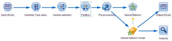 The data collection was performed by a personal computer that was running the developed KNX-IBM gateway software. As explained above, the developed software records and transmits any message that is traveling through the KNX bus (twisted pair). The developed software creates a new database entry for every KNX bus message that contains a predefined group address. Using the developed method, the data collection rate can vary from one to ten samples per minute (approximately 7000 samples per 24 h). The obtained data intervals were normalized (feature scaling or min-max normalization) using Microsoft Excel. In the third step of the implementation, the IBM SPSS Modeler software was used for the development of predictive models. Figure 8 shows an example of a data stream in IBM SPSS Modeler 18. The data are imported using an Excel node. The filter and type nodes select relevant data and assign correct data types (continuous, categorical, etc.). Additionally, the type node can assign which parameters are used as predictors (input) and which as predictions (target). In IBM SPSS Modeler, K-fold, V-fold, N-fold, and partitioning methods are commonly used as validation methods. For optimization purposes, it is recommended to use a partitioning method for large datasets []. The partitioning method randomly divides (the ratio of this division can be defined) the input datasets into three parts of training, testing, and validation. In this experiment, 40% of the input data were used for training of the models and 30% of the data for testing partition, which were mainly used for selecting the most suitable model and prevention of overfitting. The validation partition (30% of the input data) was used to determine how well the models truly perform. Using this partition, the developed models perform predictions using only predictors. The obtained results were compared with the reference signal. The partitioned data were fed directly to statistical predictive models (linear regression, random tree, and neural networks (MLP)). The resulting predictions can be exported to Excel files or analyzed using built-in functions such as plots and analysis nodes.
