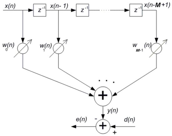 Figure 10 describes the Mth-order transversal AF. The filter input signal is denoted by , the required signal is denoted by , and the filter output signal is denoted by . The output sequence of the individual values of the AF signal is calculated used Equation (15):