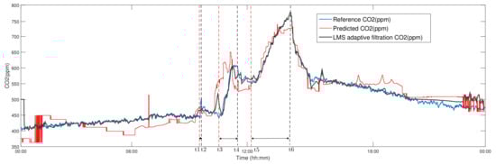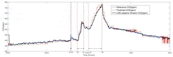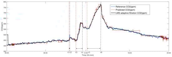 To filter the predicted course of CO2 concentration by LR, an LMS AF was applied to suppress the additive noise from the CO2 reference signal measured (ppm) (Figure 11), while maintaining the convergence and stability with the parameters set (filter order M = 48, step size parameter ). The implemented adaptive LMS filtration significantly improved the course of the resulting predicted course of CO2 concentration. The calculated correlation coefficient between the courses of reference CO2 (ppm) and the LMS AF of CO2 (ppm) (Figure 11) reached 98.66%, which is higher than the calculated value of the correlation coefficient of 93.60% between Reference CO2 (ppm) and LR predicted CO2 (ppm) in Figure 11 as well as in comparison with the results indicated in Table 1 and Table 2.