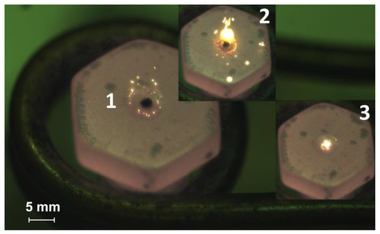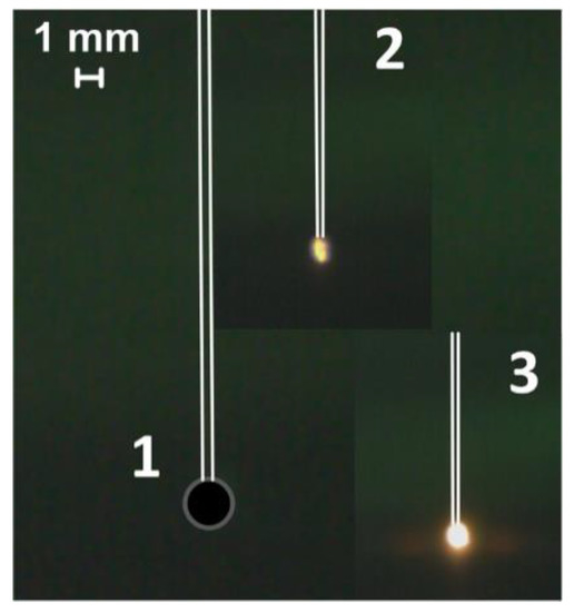 Figure 1, Figure 2, Figure 3 and Figure 4 present video frames of CLF droplets from the moment they are placed in an oxidizing environment (1), ignition (2) and combustion (3) for each experimental method described above. We recorded the investigated processes of ignition initiation of CLF droplets using the high-speed video camera Phantom Miro M310 11 (maximum shooting speed of 3260 fps at full definition of 1280 × 800 pixels). The change of a CLF droplet temperature during its heating and combustion was monitored using a system consisting of a National Instruments 9213—high-speed data acquisition system and a low-inertia thermocouple (platinum to platinum/rhodium thermocouple, measured temperature range 0–1600 °C, error ±1 °C, inertia 0.1 s, junction diameter 0.1 mm).