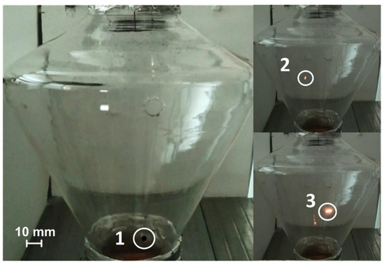 Initiation of combustion of a souring CLF droplet in a flow of heated air (Vg ≈ 4 m/s) at the cone-shaped channel inlet: 1—the moment of the droplet falling; 2—ignition; 3—combustion.