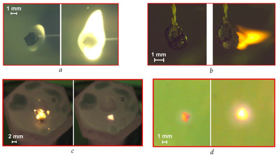 Several features characterize each method (Figure 1, Figure 2, Figure 3 and Figure 4) of the combustion initiating of the CLF droplets. They are determined mainly by the composition of the fuel, the properties of its components and the temperature. Figure 5a shows the frames of gas-phase ignition and fiery combustion of CLF based on filter cake of low-caking coal and waste turbine oil in a muffle furnace (Tg ≈ 600 °C). We recorded dispersion effects (Figure 5b) during the ignition and combustion of a slurry droplet of CLF based on lignite, water, and waste turbine oil, which are mainly due to the high content of volatile of lignite. Dispersion increases with increasing airflow temperature. We observed the same effect when initiating the combustion of CLF droplets on a heated metal substrate (for the composition with low-caking coal and the addition of lignite) (Figure 5c). Detection of the boundaries of the ignition and combustion stages of the soar CLF particle (Figure 5d) in a swirling flow of heated air is more complicated since the fuel particle is constantly moving in different parts of the model combustion chamber.
