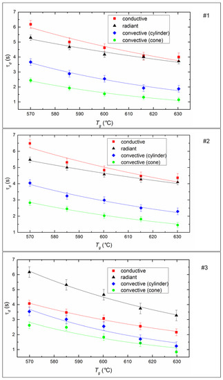 The ignition delay time (τd) of fuel is one of the determining parameters of the efficiency of CLF combustion. It characterizes the inertia of the combustion initiation process and depends on a number of determining factors (temperature, droplet size, fuel properties, etc.). It is expected that the ignition delay time decreases for all fuel compositions and all methods of heat supply (Figure 7) if heating temperature increases, because the processes of heating, dehydration, oil evaporation, and thermal decomposition of the solid slurry component intensify with an increase in heat flow. When varying the temperature from 570 to 630 °C, the ignition delay times decrease by 20–40% on average (Figure 7).