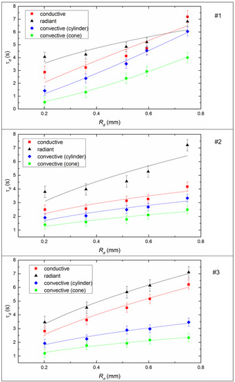 Figure 8 shows the effect of the initial size of the fuel droplets on the inertia of the ignition. It is easy to see that the ignition delay time increases with increasing droplet size for all studied fuels, because the heat consumption for endothermic evaporation and decomposition processes increases in the case of larger fuel droplets. Furthermore, the heat sink intensifies to the deep layers of the slurry droplet, which leads to a decrease in the rate of the temperature growth of the slurry droplet surface during the heating process. In the experiments, the ignition delay times increased on average by a factor of 1.8–2.2 with conductive heating, 1.5–3.2 with convective heating, and 1.5–2 with radiative heating when the initial radius of the droplet changes from 0.4 mm to 0.75 mm (Figure 8).