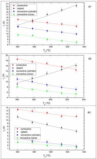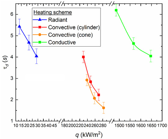 Figure 10 illustrates that it is necessary to supply different amounts of heat flux to the fuel to achieve the same ignition time when using different heating schemes. In particular, to provide the value τd ≈ 4 s the heat flux is about 33 kW/m2 in the muffle furnace, it is about 188 kW/m2 with convective heating of a fixed droplet in the cylinder, and it is about 1647 kW/m2 with conductive heating on a hot surface. Thus, we can conclude that the radiation is most attractive to accelerate the initiation of fuel combustion heating in terms of energy savings. The local (conductive) heat supply is the least effective from this point of view (Figure 10). However, in terms of fire safety, this approach has a great advantage. Unregulated fuel combustion (most common for pulverized coal or other dry fine fuel [33]) at thermal power plants or boiler houses may occur due to the contact with heated surfaces (for example, parts of mechanisms). Based on the results of the assessments (Figure 10), it can be concluded that the ignition is most difficult with the conductive heat supply to a fuel. At the same time, a thin surface layer of the ash encrust is formed in the contact zone between the hot surface and the fuel, which leads to a decrease in the intensity of oxidation reactions.