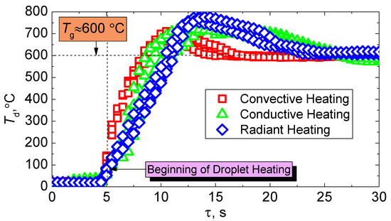In this work, the conditions of the experiment and the limitations of the installation influenced the choice of the size range of the droplets of the slurry. The main goal of this study was to analyze the possible differences in the combustion parameters for different heating schemes, but with a further decrease in droplet size (Rd < 0.2 mm), the processes proceed very quickly and it becomes quite difficult to determine the required characteristics. For this reason, most likely, most researchers use the range 1 ≤ Rd ≤ 2 mm [30,31,32] to detail experiments with drops of fuel mixtures.