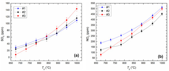 Dependences of SOx (a) and NOx (b) concentrations on the heating temperature during the combustion of the CLF compositions in a muffle furnace (radiation heat exchange). Fuel compositions #1–3 from Table 3.