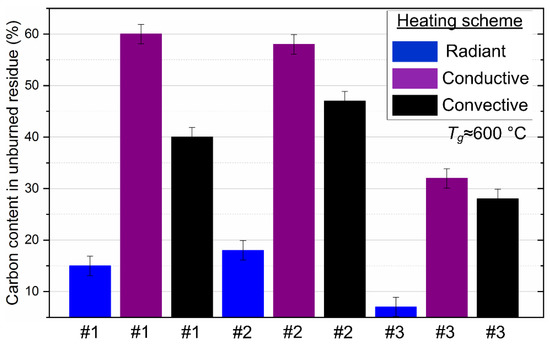 The proportion of carbon contained in the unburned residue of droplets of the studied CLF compositions with different heating schemes. Fuel compositions #1–3 from Table 3.
