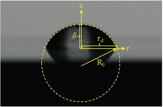 Here denotes density and V are droplet baseline radius and volume. As geometrical parameters rd, and R0 are the droplet baseline radius, apex height and curvature, respectively. is the contact angle of the droplet. Droplet volume equation (2) was reformulated by using non-dimensional numbers: Bond number (Bo), which is the ratio of gravitational and surface forces, two geometrical similarity simplexes—G1 and G2—which describe the droplet geometry and V* as the non-dimensional droplet volume.