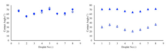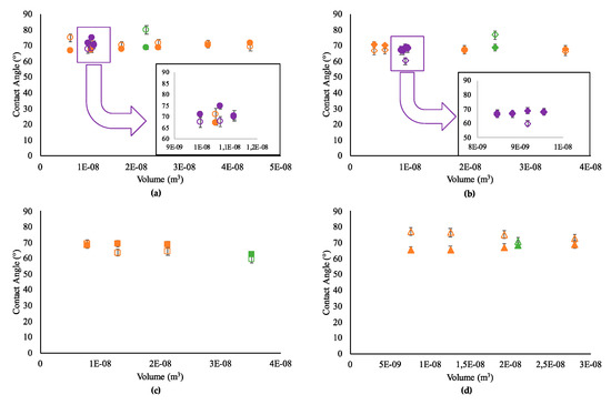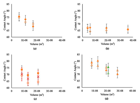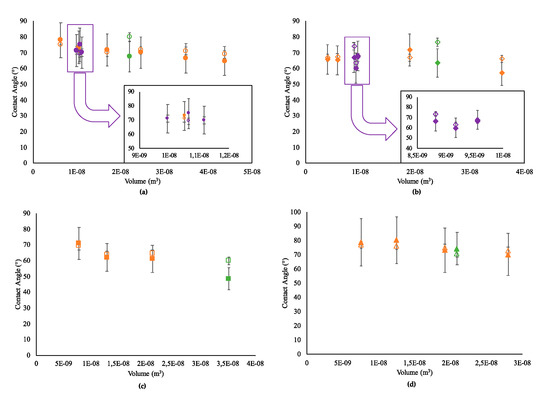 - Vafaei, S.; Podowski, M. Analysis of the relationship between liquid droplet size and contact angle. Adv. Colloid Interface Sci. 2005, 113, 133–146. [Google Scholar] [CrossRef]
