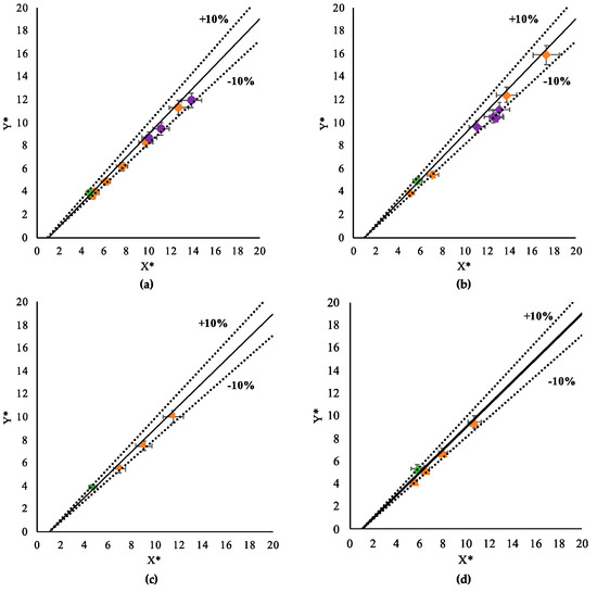 Yonemoto and Kunugi (YK) model validity for fluids at various volumes. Working fluids are (a) DIW, (b) Au NF, (c) GO NF and (d) Al2O3 NF. Colors indicate: orange—UJI, green—UR1 and purple—İzmir Kâtip Çelebi University (İKÇÜ).