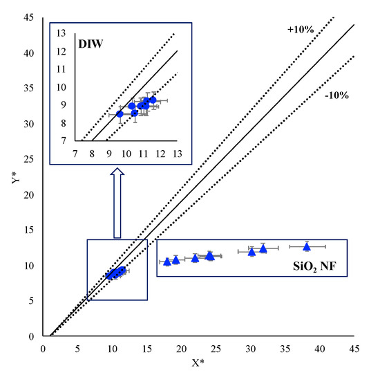 The modified YK model was in good agreement with experimental results for DIW, Au, Al2O3 and GO nanofluids. As shown in Figure 4, all the data was in the range of the ±10% error band. However, the results for the SiO2 NF (Figure 5) show again that a single-phase model was not appropriate for a highly concentrated nanofluid.