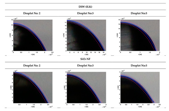 Vafaei and Podowski [32] also developed a model to predict droplet shape based on force balance (Equation (15)). This subsection presents the validity of this model for nanofluids considered in this study. For volume dependent analysis, droplets had a maximum 21 μL of volume (Figure 10). For constant volume analysis of DIW and SiO2 NF, droplets that had maximum, minimum and average contact angles were chosen (Figure 11).