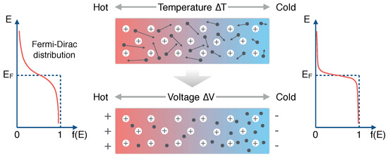 One can understand the origin of the Seebeck effect from the illustration shown in Figure 1. Let us consider a material, in which one side is touched to a cold source while the other side to a hot source. There is a large distribution of electrons above the Fermi energy at the hot region according to Fermi-Dirac’s distribution function (Figure 1 left), while there is small distribution of electrons above at the cold region (Figure 1 right). In addition, the carriers have the higher kinetic energy (KE) at the hot region because the average KE value is about for an ideal gas, where is the Boltzmann constant and T is the absolute temperature. From this fact, carriers in the hot region are more agile than those at the cold region. As a result, the carriers (either electrons above or holes below ) will diffuse from the hot region to the cold region, which may generate in the material. However, if the electrons and holes move in the same direction, we do not get a net electronic current because they will cancel charges each other. Thus a useful TE device should consists of p-type and n-type semiconductors. Since CNTs allow us to have both p-type and n-type semiconductors [27,29,30], a TE device with a single chirality CNT [31] used for both legs is feasible.