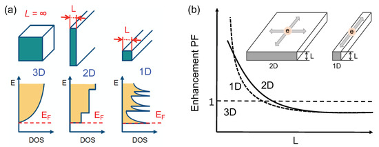 (a) Electronic density of states for a bulk (3D), two-dimensional (2D) and one-dimensional (1D) materials. (b) Enhancement power factor PF is potted as a function of confinement length L for low-dimensional materials.