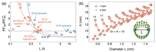 (a) Enhancement of power factor PF scaled by that for 3D materials is plotted as a function of , where L and are the confinement length and the thermal de Broglie length, respectively. The lines and dots, respectively, denote theory and experiments for several materials. It is clear that enhancement PF occurs when (or ) for the 1D and 2D materials. Adapted with permission from Reference [13]. Copyright 2016, American Physical Society. (b) Thermal de Broglie wavelength of many s-SWNTs is plotted as a function of s-SWNT diameter L. Adapted with permission from Reference [46]. Copyright 2019, Springer Publishing.