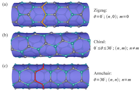 where . The chiral angle is defined as the angle between and with . One can classify the according to its value that follows a certain symmetry as shown in Figure 4, from which three types of SWNTs emerge: (a) zigzag, (b) chiral and (c) armchair SWNTs. Various geometries will give rich physical properties of SWNTs.