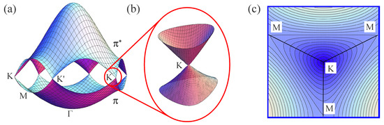 Graphene’s energy dispersion in its first BZ. The energy dispersion is shown for the whole region of the 2D BZ in panel (a), while in panel (b) the energy dispersion is shown near the point. Panel (c) gives the contour plot of the dispersion around the point. Reproduced from the Ph.D. thesis of one of the authors [64].