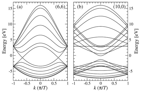 Examples of 1D dispersion relations for : (a) armchair SWNT with chirality , and (b) zigzag with chirality . There are no bandgaps can in the case (a), thus the is metallic, while the in (b) is semiconducting due to the appearance of a gap. Redrawn with different style by the authors adapting from Reference [62].