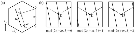 Note that, if is an integer, has an integer number of components, thus one of the cutting lines will pass through the point, giving rise to a metallic . On the other hand, if is not an integer, i.e, the remainder of the division is either 1 or 2, the point will lie at one third or two third of the spacing between two adjacent cutting lines near the point, thus giving rise to a semiconducting , as shown in Figure 8b. Therefore, three types of are obtained based on their metallicity. They are often referred to as -, - and -, which are given by the following conditions: