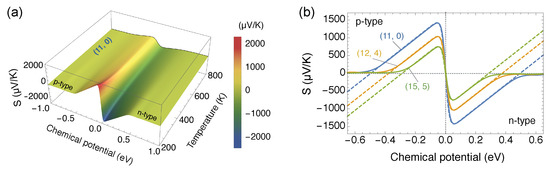 In Figure 9b, the solid and dashed lines represent the numerical and analytical results of the Seebeck coefficient using Equation (17) and Equation (20), respectively, for the (11, 0), (12, 4) and (15, 5) s-SWNTs. As shown in Figure 9b, the analytical results from Equation (20) reproduce the numerical results near , in which S for the p-type and n-type s-SWNTs can be well-reproduced at near (i.e., the Fermi energy is located at the middle of band gap). At larger values, the two-band model is no longer valid for S at a higher doping level. Therefore, the analytical results deviate from the numerical results at larger values, as shown in Figure 9b. However, if we focus on the optimum values of S, the two-band model is sufficient to calculate S of the s-SWNTs.