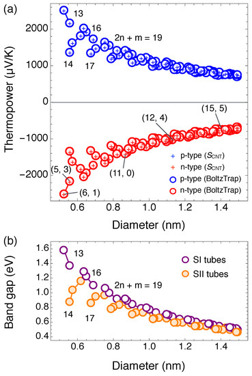 - Hung, N.T.; Nugraha, A.R.T.; Hasdeo, E.H.; Dresselhaus, M.S.; Saito, R. Diameter dependence of thermoelectric power of semiconducting carbon nanotubes. Phys. Rev. B 2015, 92, 165426. [Google Scholar] [CrossRef]