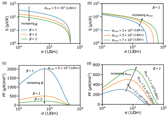 Effect of the fitting parameters (a) and (b) on the Seebeck coefficient S – electrical conductivity curves described by the modified Mott-Heike relationship in Equation (21). Effect of the fitting parameters (c) and (d) on the power factor PF – electrical conductivity curves.
