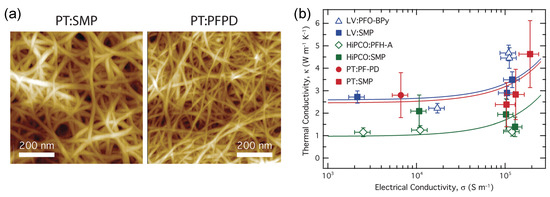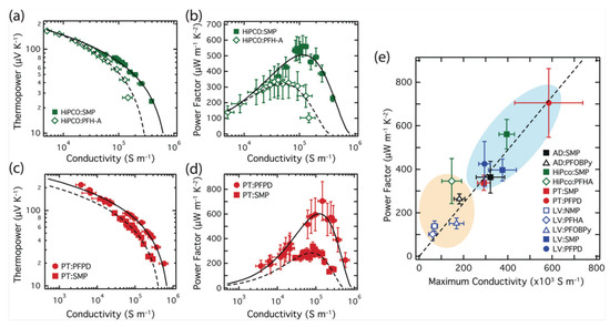 (a) Seebeck coefficient (or thermopower) and (b) power factor are plotted as functions of electrical conductivity for high-pressure disproportionation of carbon monoxide (HiPCO) s-SWNT networks. (c) Thermopower and (d) power factor are plotted as functions of electrical conductivity for plasma-torch (PT) s-SWNT networks. (e) Relationship between the maximum power factor and the maximum conductivity for several s-SWNT networks. Adapted with permission from Reference [27], Copyright 2017, The Royal Society of Chemistry.