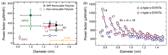 In Figure 13a, the maximum PF value is plotted as a function of the diameter of the s-SWNTs films, in which these films are extracted by the cleavable SMP and non-removable polymers (PFO-BPy or PFH-A) [27]. Both cleavable and non-cleavable s-SWNTs films show a similar diameter dependence of the PF, and it suggests that the maximum PF increases when s-SWNT diameter decreases. Since s-SWNT diameter is an important parameter for optimizing PF, the next question is which specific chiral-vector will give a highest PF. In order to analyze the dependence of s-SWNTs diameter and chiral vector on the maximum PF, we have derived an analytical formula for the PF by a one-band model as [13,14]