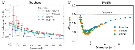 - Lindsay, L.; Broido, D.A.; Mingo, N. Diameter dependence of carbon nanotube thermal conductivity and extension to the graphene limit. Phys. Rev. B 2010, 82, 161402. [Google Scholar] [CrossRef]