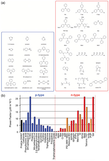 - Nakashima, Y.; Nakashima, N.; Fujigaya, T. Development of air-stable n-type single-walled carbon nanotubes by doping with 2-(2-methoxyphenyl)-1, 3-dimethyl-2, 3-dihydro-1H-benzo[d] imidazole and their thermoelectric properties. Synth. Met. 2017, 225, 76–80. [Google Scholar] [CrossRef]