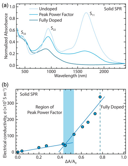 In Figure 12e, we show the relationship between the maximum PF and the maximum that are obtained at the optimal and maximum doping, respectively. Since, the maximum PF a linear function of the maximum , it suggests that the maximum can be used as a quickly metric for screening the TE potential of s-SWNT samples [27]. It notes that in order to obtain the maximum PF, both and S for a wide range of chemical potential are needed that requires a significant time and effort. In contrast, the maximum can be easily obtained by a heavy doping, that can be achieved by long exposure ( min) of the s-SWNT to a concentrated dopant solution [27].